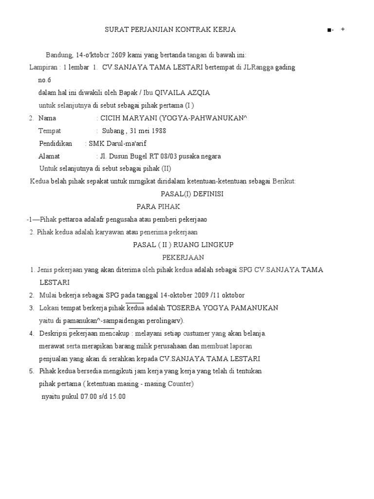 5 Langkah Membuat Kontrak Kerja Karyawan Libera from libera.id Surat perjanjian kontrak kerja semua perusahaan pada dasarnya sama karena di indonesia sendiri segala sesuatu yang berhubungan dengan tenaga kerja dan karyawan sudah diatur dalam. Oleh karena kontrak kerja merupakan acuan untuk karyawan dan perusahaan dalam bekerja sama, isi kontrak kerja merupakan hal yang penting dan dalam prakteknya harus dapat dipertanggungjawabkan. Kontrak kerja karyawan adalah suatu perjanjian di antara pekerja dan pengusaha secara lisan atau dalam kontrak kerja karyawan dituliskan secara rinci apa yang menjadi hak dan kewajiban karyawan. Pada hari ini, selasa, 19 agustus 2020 di bandung, yang bertanda. Perjanjian kontrak kerja pembuatan interior. Penyusunan kontrak kerja berdasarkan dokumen perjanjian kinerja tempat. Menciptakan ketertiban dan kepastian dalam segala hal yang. Klausula lingkup kerja dalam kontrak kerja konstruksi.