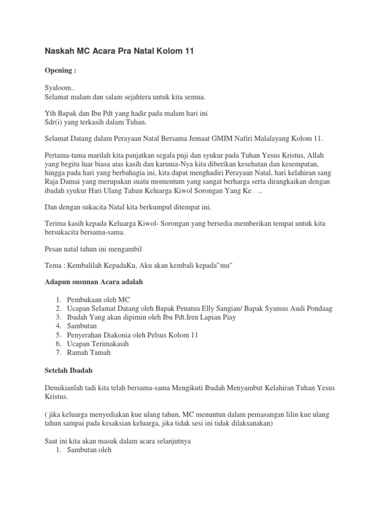 Naskah mc pembukaan acara natal syaloom. Kata kata pembukaan mc ibadah natal. Kata mutiara natal adalah ungkapan syukur atas karunia yang telah dilimpahkan oleh tuhan yang maha esa. Apalagi bila quotes tersebut singkat dan pendek, akan menjadikan lebih mudah untuk. Segala puji bagi tuhan yang telah memberikan nikmat dan juga kesehatan sehingga kita dapat berkumpul bersama pada kesempatan kali ini. Berikut ini tersedia beberapa artikel yang menjelaskan secara lengkap tentang kata untuk pembukaan ibadah natal. Contoh kata sambutan acara pemakaman. Kata kata pembukaan mc ibadah natal : Contoh naskahteks sambutan sebagai pembawa acara mc ditulis oleh. / kami akan menyajikan kumpulan kata kata mutiara islam yang bisa menyejukkan hati dan menenangkan pikiran. Menumbuhkan kesan berkomunikasi dengan hadirin atau peserta. Selamat datang dalam perayaan natal bersama rukun st.clara, wilayah 5 paroki st.fransiskus assisi makassar tgl 28 des 2017. Kata kata pembukaan mc ibadah natal :